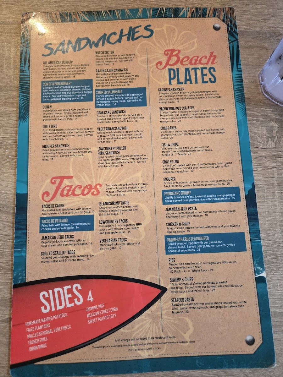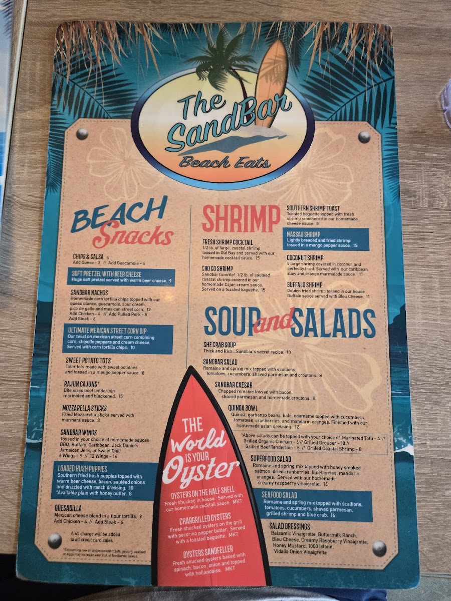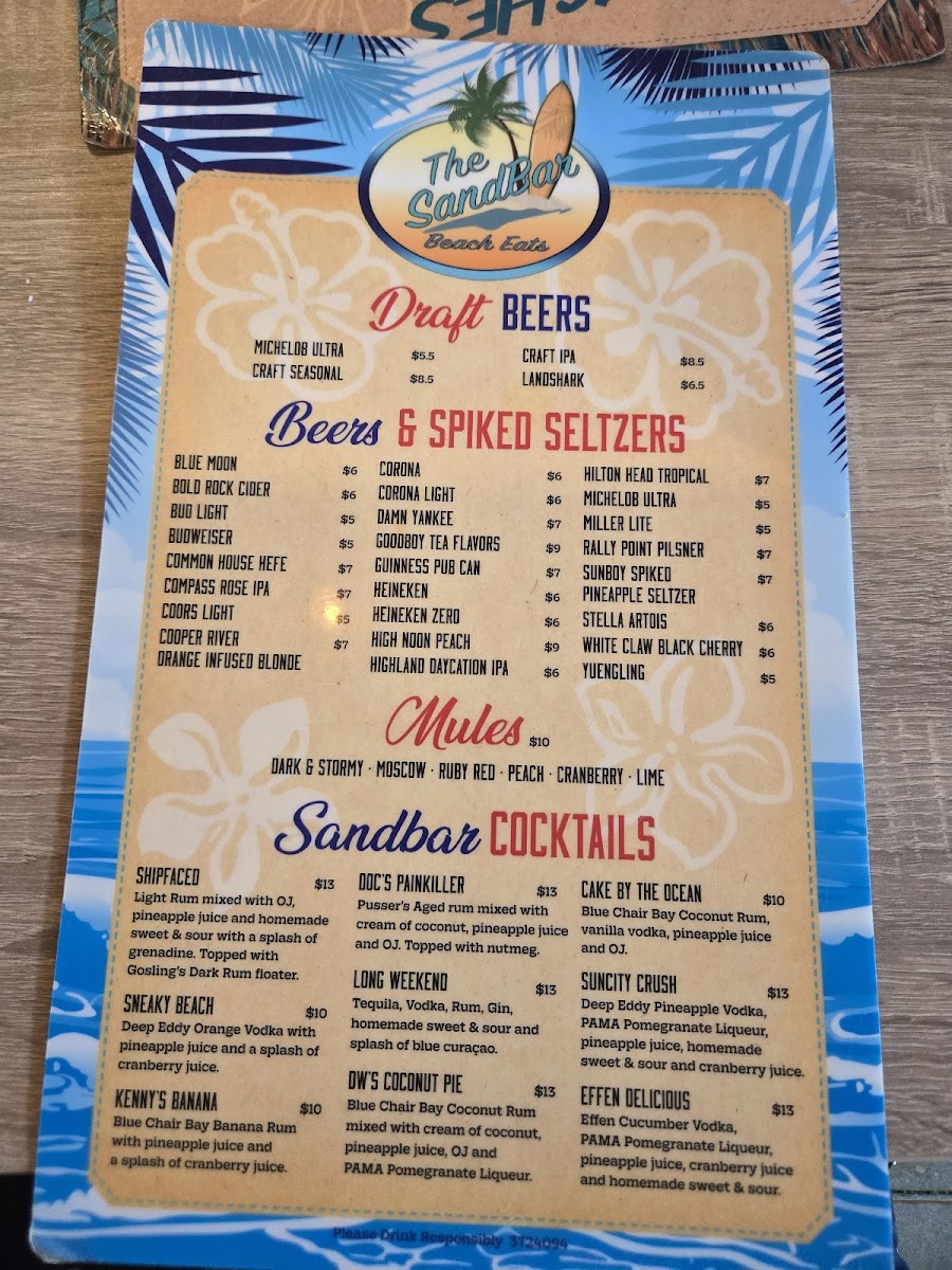 The service is attentive, and the lively atmosphere, complete with music and outdoor seating, enhances the overall experience. The Sandbar embodies a beachy chill that makes every visit memorable.